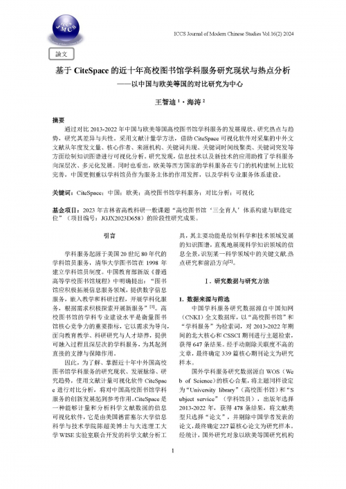 基于CiteSpace的近十年高校图书馆学科服务研究现状与热点分析 ——以中国与欧美等国的对比研究为中心