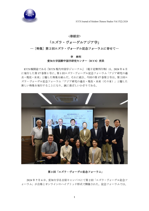 <巻頭言>「エズラ・ヴォーゲルアジア学」 ―[特集]第2回エズラ・ヴォーゲル記念フォーラムに寄せて―