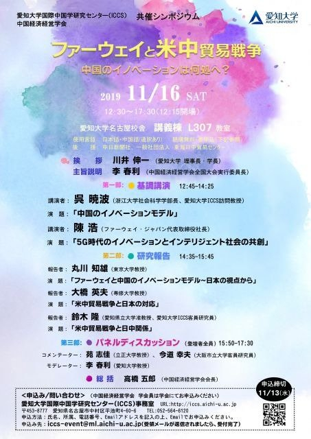 愛知大学国際中国学研究センター、中国経済経営学会共催シンポジウム「ファーウェイと米中貿易戦争ー中国のイノベーションは何処へ?ー」開催(11/16)