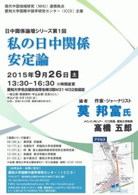 愛知大学国際中国学研究センターでは、以下の通り、日中関係論壇シリーズ「私の日中関係安定論」を開催いたします。