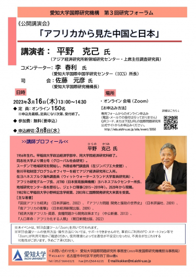 愛知大学国際研究機構主催第3回研究フォーラム「アフリカから見た中国と日本 」をオンラインにて開催いたしますので、ご案内申し上げます。