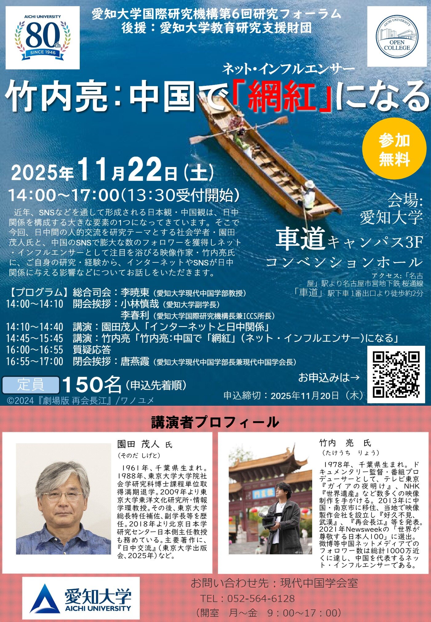 愛知大学国際研究機構第6回研究フォーラム「竹内亮:中国で『網紅(ネット・インフルエンサー)』になる」を開催いたしますので、ご案内申し上げます。