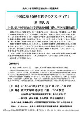 2013年10月21日(月)愛知大学車道校舎にて、ICCS客員研究員の彭新武教授(中国人民大学)を講師として、「中国における経営哲学のフロンティア」と題する講演会を開催いたします。